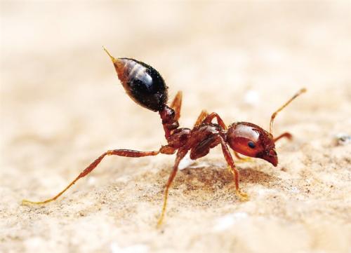 介殼蟲的行為。紅火蟻群體生存、發(fā)展需要大量的糖分,蜜汁、糖、蛋白質(zhì)、脂肪等食物也在紅火蟻的食譜上。紅火蟻幼蟲在某齡以前只吃液質(zhì)食物,而后能夠消化固體食物。工蟻帶來富含蛋白質(zhì)的固體食物放置在幼蟲的嘴前。幼蟲分泌消化酶分解固體食物并反芻給工蟻。蟻后靠取食一些消化過的蛋白質(zhì)來維持產(chǎn)卵的需要。只要有足夠的食物,蟻后就能夠發(fā)揮其最大產(chǎn)卵效率。